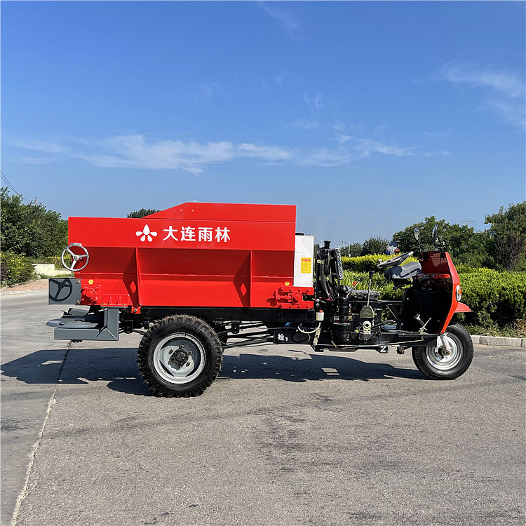 自走式系列三轮车撒粪机,采用农用三轮车底盘架构,设计配备肥料输送装置和肥料抛撒装置,后置水平双圆盘撒肥装置抛撒肥料。该三轮自走撒粪车自带柴油机动力,无需拖拉机带动,一体机设计,结构紧凑,转向灵活,尤其适用于大棚、丘陵、小块田地作业。该撒肥车适合抛撒各类厩肥、粪肥、有机肥、石灰、酒糟、糖渣、颗粒肥等不同形态的物料。操作简单,适用性广,可达到提高施肥效率、降低劳动强度、改善土壤结构等目的。