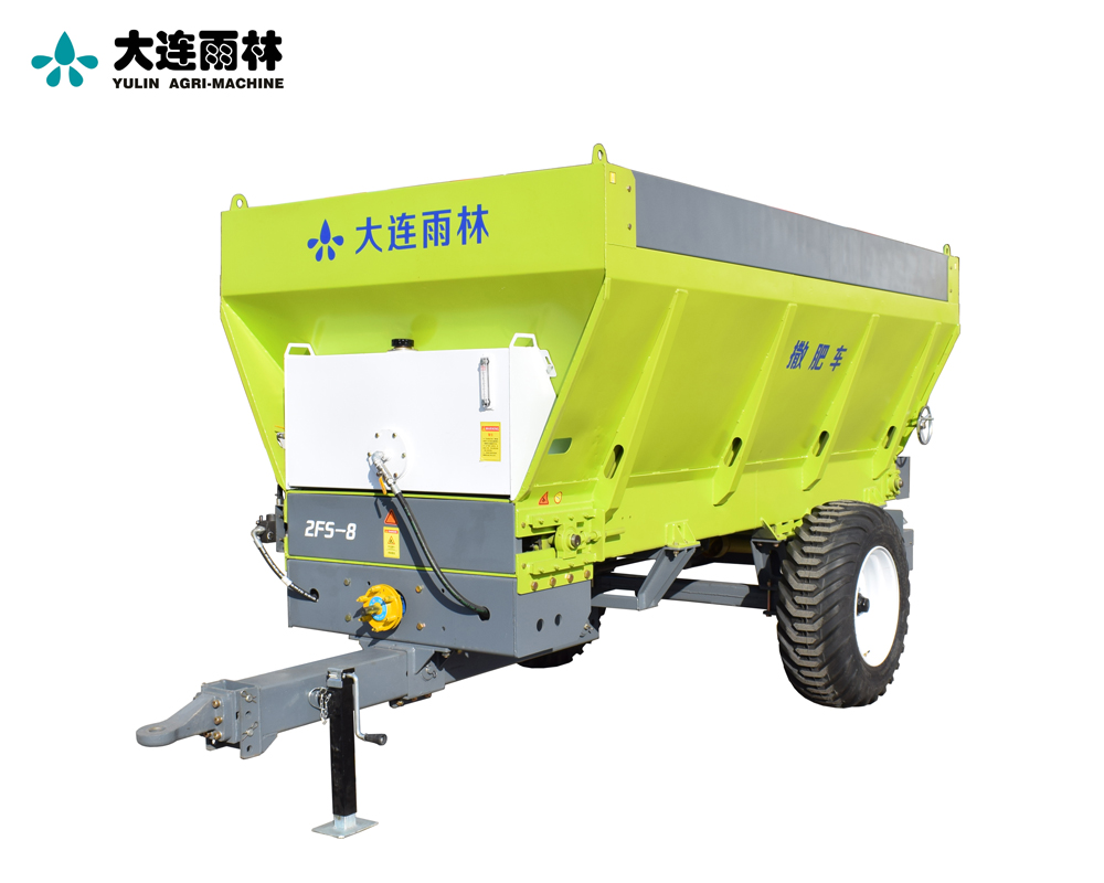 2FS系列有机肥撒施机由肥料箱、链排送肥装置、圆盘抛撒装置、牵引装置、行走装置、动力传递装置等零部件组成。肥料箱是有机肥的存储单元,动力传递装置负责将动力传递给各个执行部件,输送装置负责将有机肥输送到抛撒装置处,由高速旋转的撒肥盘将肥料均匀、高效抛撒出去。