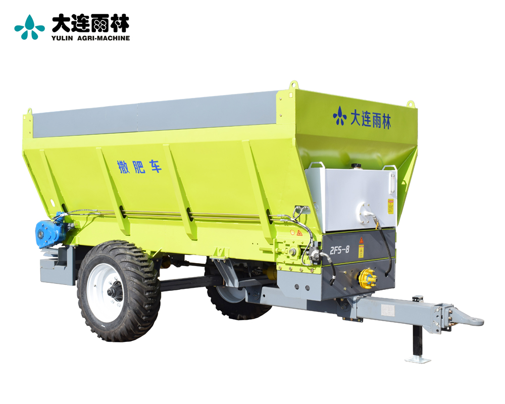 2FS系列多功能有机肥施肥机由拖拉机牵引在田中行走,拖拉机通过后动力输出将动力传出至前驱动齿轮泵和变速箱,通过齿轮箱变速换向后一部分动力传送至棘轮调速机构,然后传递到送肥链排输送的主动轴,带动链板将肥料往后输送。另一部分动力在离合器的作用下,将动力传送至拨料辊破碎撒肥机构或圆盘撒施机构并驱动圆盘式撒肥机构,肥料落入撒施圆盘上,肥料通过撒肥机构抛撒至田中,完成撒肥作业过程。主要适用于各种农牧场的耕前底肥撒施,可在田间、草地、牧场、公路等地进行厩肥、粪肥、有机肥、石灰、酒糟、糖渣、颗粒肥等不同形态固体物料的抛撒工作。